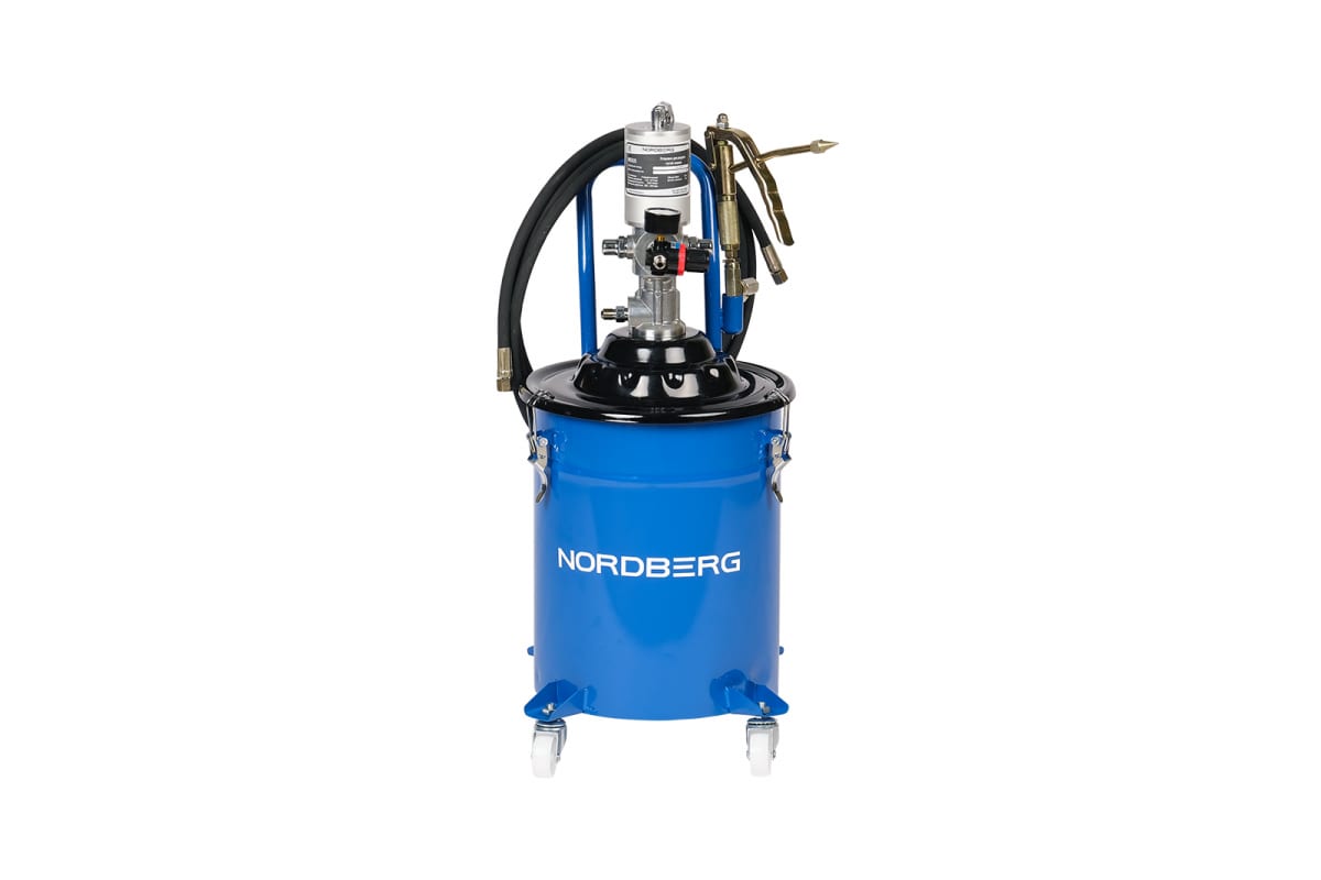 Пневматическая установка для раздачи густой смазки NORDBERG с баком 20 л NO5020 функционирует от сжатого воздуха. Полностью безопасна для окружающей среды. Резервуар рассчитан на 20 кг масло-смазки, а гибкий шланг предоставляет удобный доступ к узлам и агрегатам.