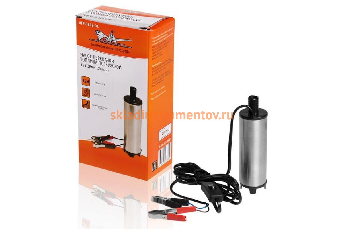 Погружной насос перекачки топлива 12В 38мм 12л/мин Airline AFP-3812-01 используется для емкостей с узким горлом. Устройство подключается посредством зажима "крокодил", сечение кабеля - 0.3 кв.мм. Насос подходит для эксплуатации в диапазоне температур от +5 до +40 градусов.