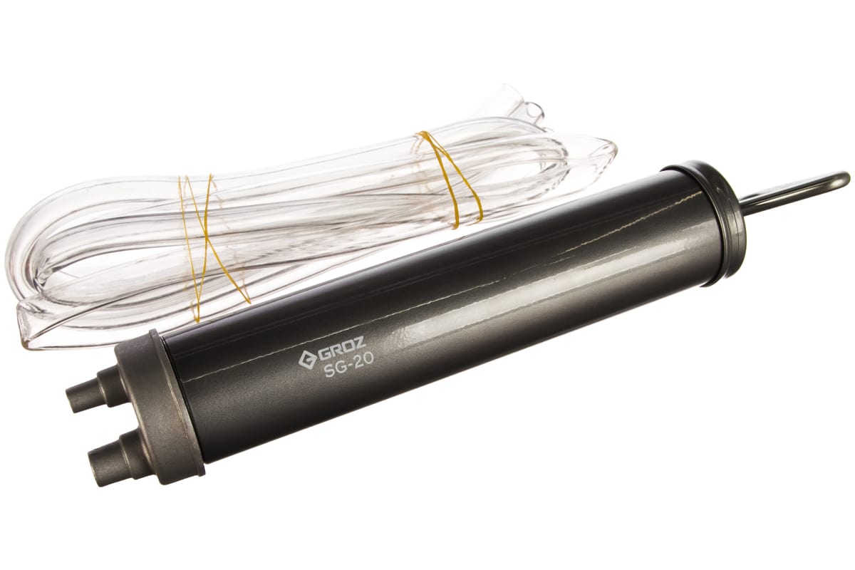 Шприц для перекачки двойного действия, два шланга по 1м GROZ GR45250 - SG/20 активно применяется для работы с материалами, представляющими особую опасность и вредность для человека, например: топочный мазут, минеральные, синтетические и натуральные масла, охлаждающие жидкости, спирты, тормозная жидкость и пр. Шприц отличается простотой и высокой эффективностью в работе. Для изготовления инструмента используются прочные и надежные материалы: медь, алюминий, вайтон и ПВХ.
