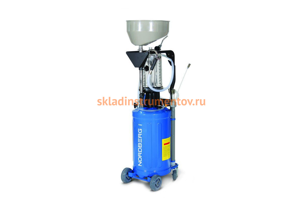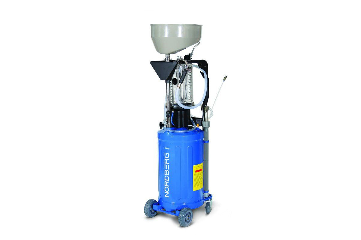 Оборудование для работы с маслом NORDBERG 2380-CV удаляет отработанные технические жидкости из любого транспортного средства при помощи вытяжной системы.