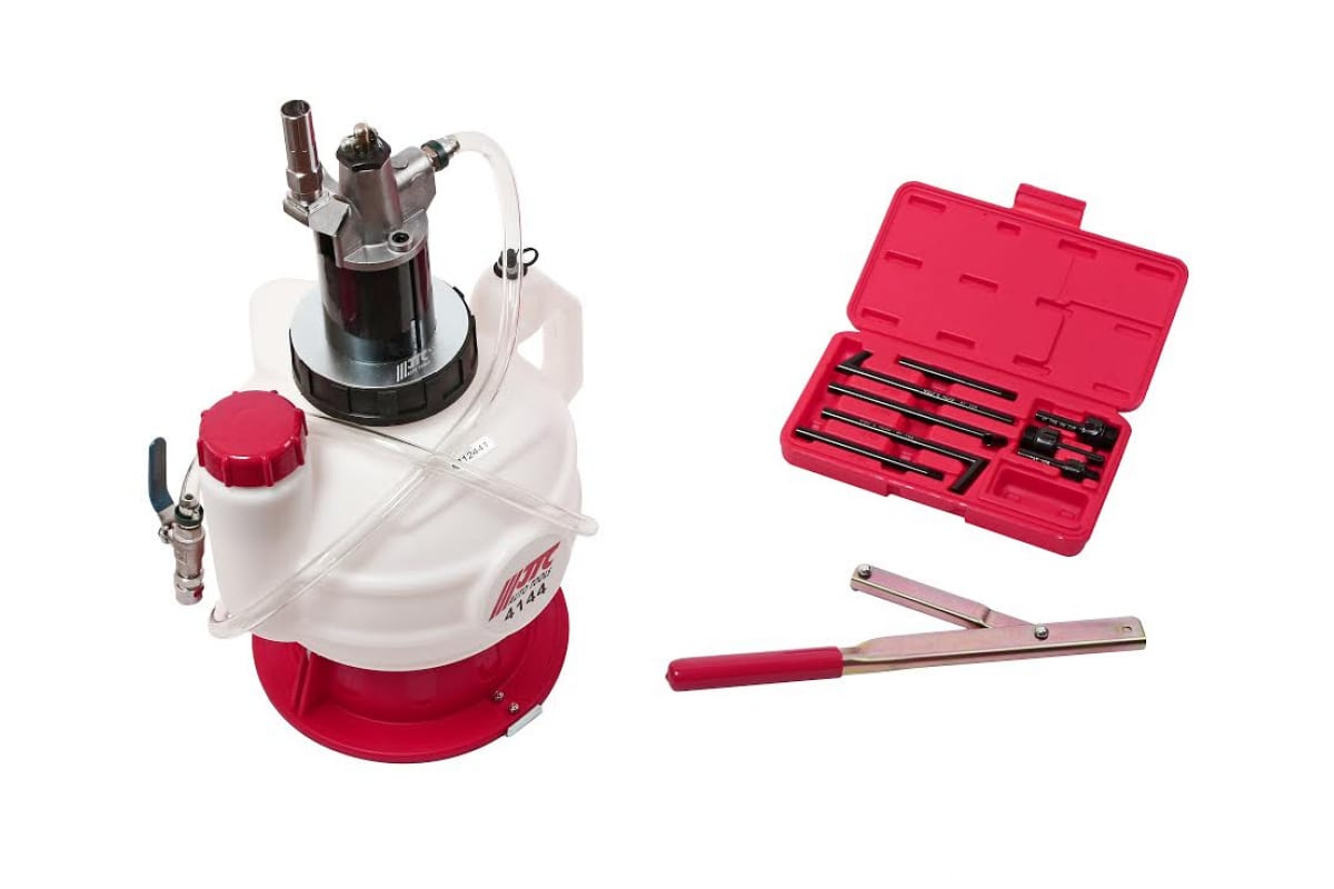 Ручной диспенсер для заправки АКПП со сменными адаптерами JTC 4144 предназначен для профессионального использования в условиях автосервиса или СТО автомобилей. С помощью данного приспособления можно быстро и качественно осуществить заправку АКПП специальным трансмиссионным маслом - ATF. Большая длина шланга - 1300 мм, позволяет механику свободно перемещаться по рабочей площадке. Набор фитингов, входящий в комплект, делает диспенсер универсальным в применении, так как подходит для различных марок автомобилей (Фольксваген, Ауди, Мерседес и т. д.).