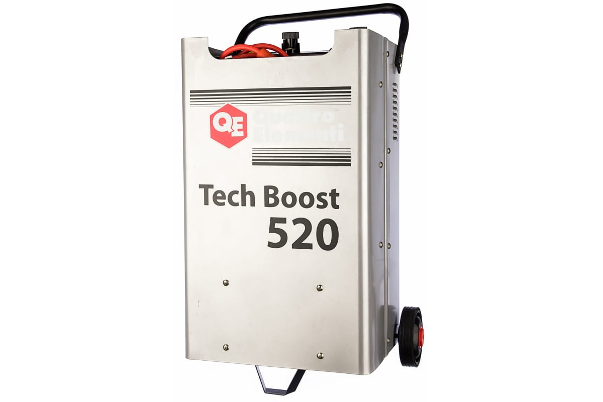 Пуско-зарядное устройство QUATTRO ELEMENTI Tech Boost 520 771-466 - это аппарат высокой мощности, используемый для запуска двигателей автотранспорта, а так же для зарядки аккумуляторов емкостью от 80 до 750 Ач. Не смотря на вес прибора его легко перемещать - это стало возможным за счет специальных прорезиненных колес большого диаметра, которые обеспечивают плавное движение, а также не повреждают различные покрытия, например кафель, дерево и другие поверхности. Номинальный зарядный ток устройства - 50 А, пусковой - 280 А.