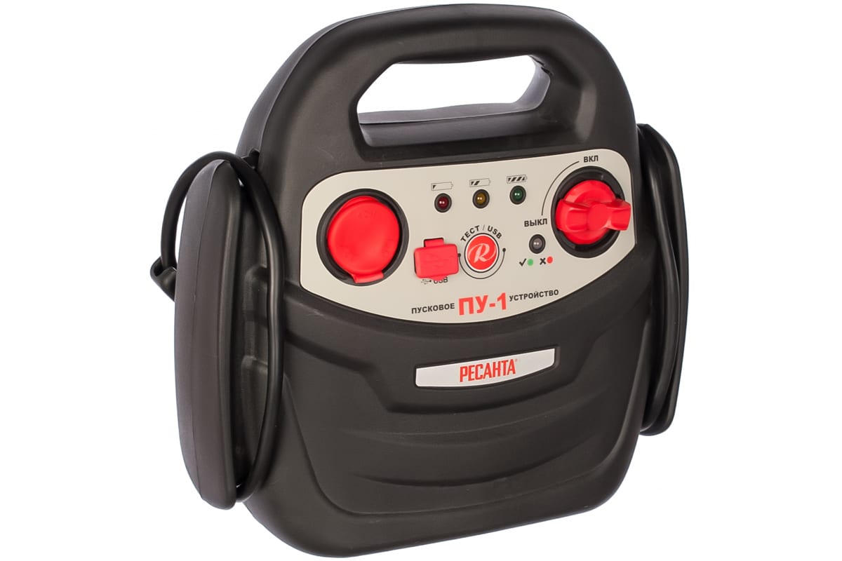 Пусковое устройство Ресанта ПУ-1 применяется для запуска двигателя генератора, автомобиля, катера. Модель оснащена встроенным аккумулятором, который не требует техобслуживания. Для удобства транспортировки сверху корпуса располагается ручка эргономичной формы.