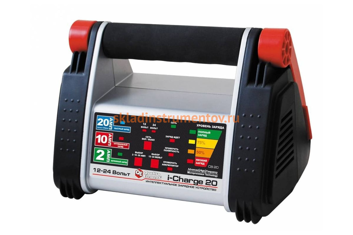 Зарядное устройство QUATTRO ELEMENTI i-Charge 20 полный автомат 771-169 используется для зарядки свинцово-кальциевых, гелевых, герметичных и свинцово-кислотных аккумуляторов легковых автомобилей, мотоциклов, а также автобусов напряжением 12 и 24 В. Управление всеми рабочими процессами аппарата осуществляется встроенным микропроцессором высокочастотного преобразования. Номинальный зарядный ток для напряжения 12 В - 12.5 А, а для 24 В - 6.5 А.