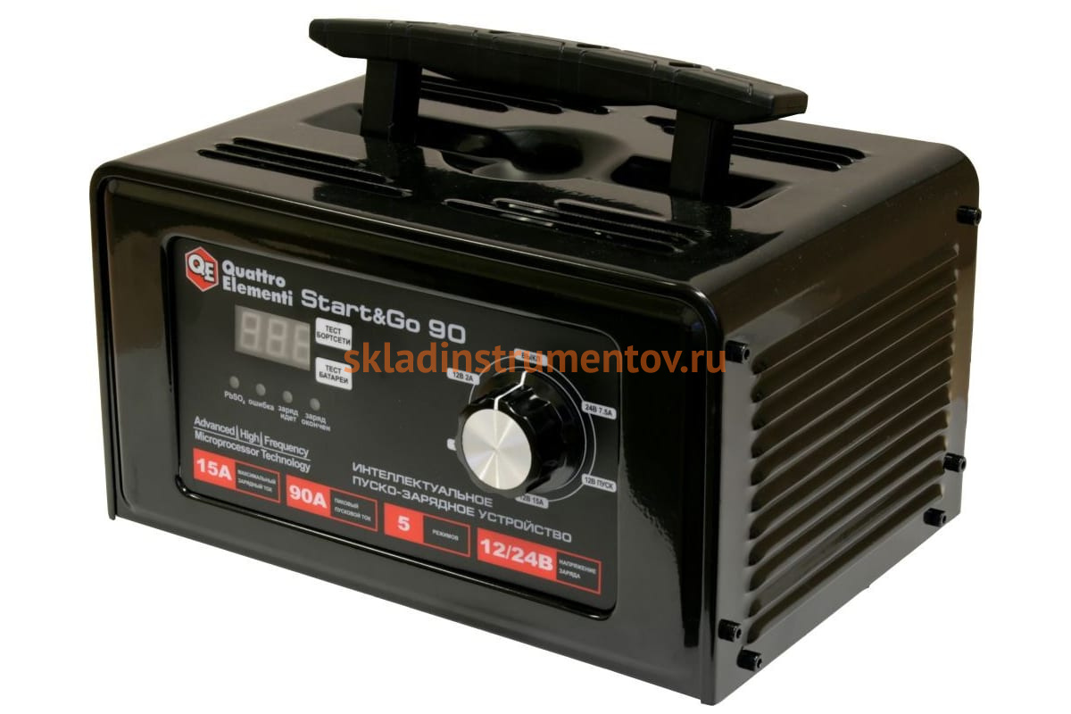 Пуско-зарядное устройство QUATTRO ELEMENTI Start&Go 90 772-470 рекомендуется для заряда различных типов автомобильных аккумуляторов емкостью от 6 до 150 Ач. Для удобства эксплуатации все элементы управления и контроля за аппаратом, такие как регулятор режима заряда, цифровой дисплей, световые индикаторы, расположены на лицевой панели корпуса. Устройство обладает небольшими габаритами, поэтому с легкостью поместится в багажнике автомобиля. Номинальные значения зарядного и пускового тока - 10 и 60 А соответственно.