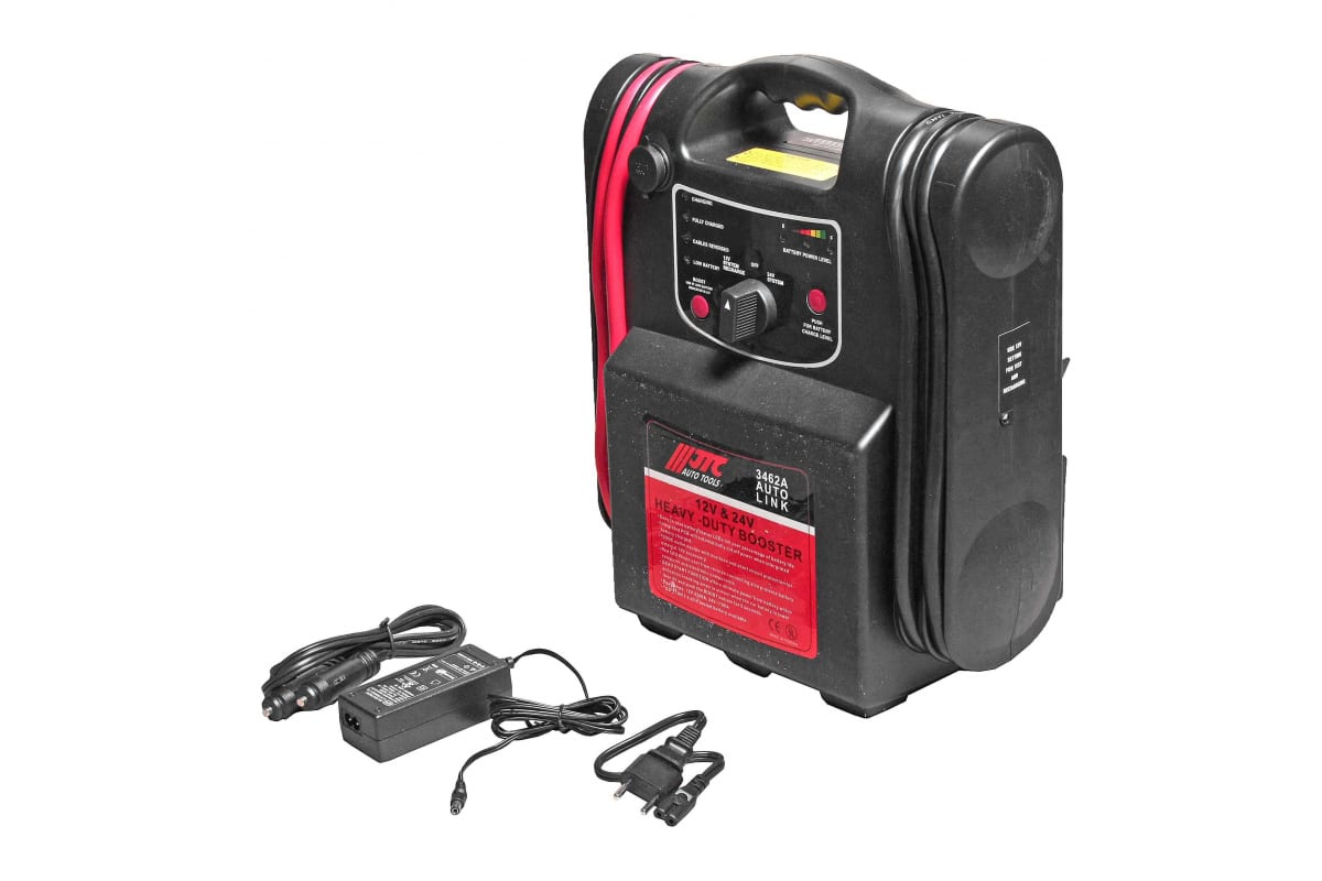 Пусковое устройство со встроенным аккумулятором, 2200/1100А JTC 3462A используется для быстрого запуска автотранспортных или же других аккумуляторов напряжением в 12 и 24 вольт. Благодаря небольшим размерам аппарата пользователь всегда сможет держать его под рукой, например в багажнике или бардачке автомобиля. Данная модель оснащена функцией "Dead Start" позволяющая запускать практически полностью разряженные аккумуляторы (зарядка АКБ менее 5 В). Для продолжительного срока службы устройства предусмотрено его автоматическое отключение после полного заряда потребителя.