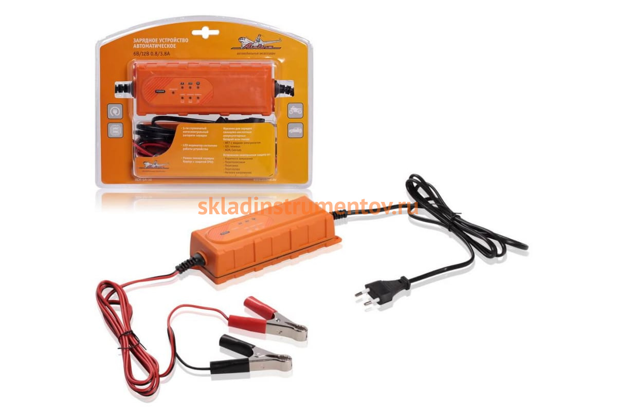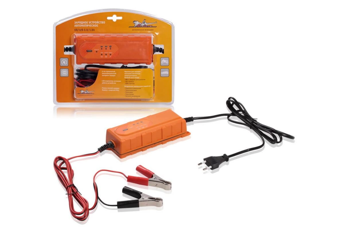 Автоматическое зарядное устройство, 0,8/3,8А, 6В/12В, электронное Airline ACH-5A-10 подходит для обслуживания свинцово-кислотных аккумуляторов (в том числе GEL, AGM, Calcium) с напряжением 6/12 В.