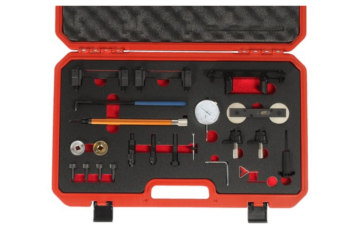 Фиксатор распредвала VW, AUDI JTC 4411 упакован в прочный переносной кейс с индивидуальными ячейками под каждую комплектующую деталь набора. Комплект содержит все необходимые инструменты для надежного удержания распределительного вала в нужном положении.