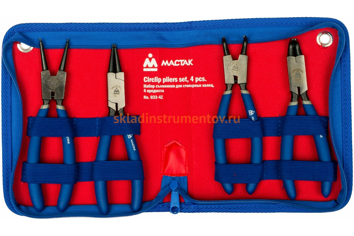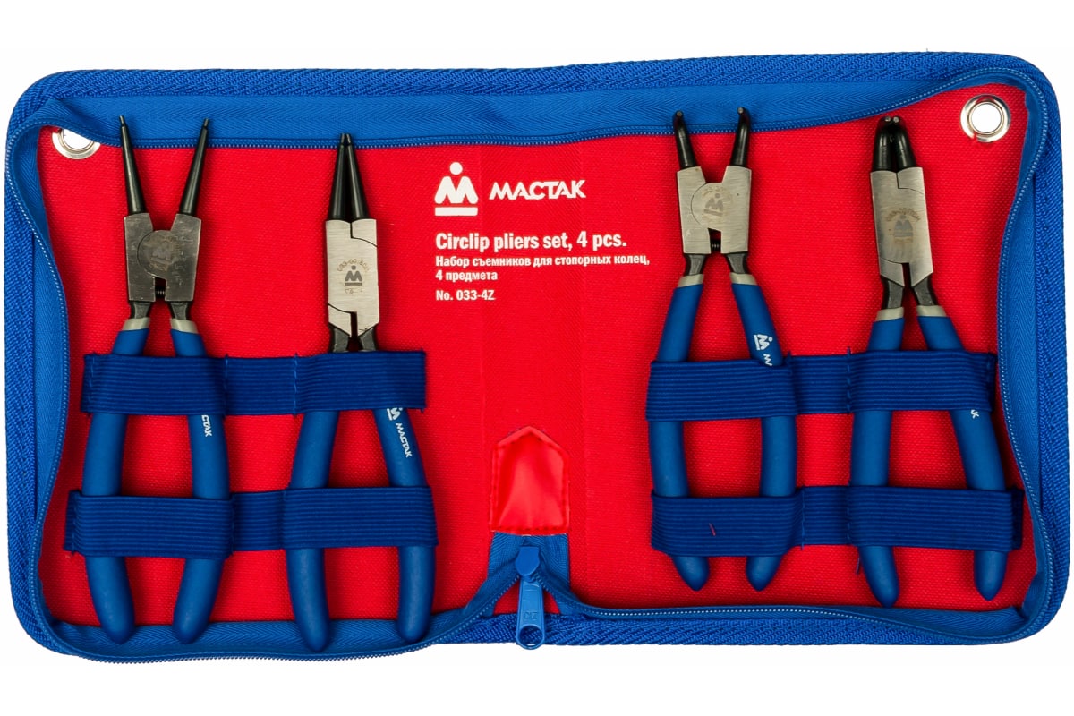 Набор съемников для стопорных колец (4 предмета в футляре на молнии) МАСТАК 033-4Z облегчает процесс демонтажа автоэлементов различного типа. Двойные резинки гарантируют надежную фиксацию инструмента в процессе перевозки.