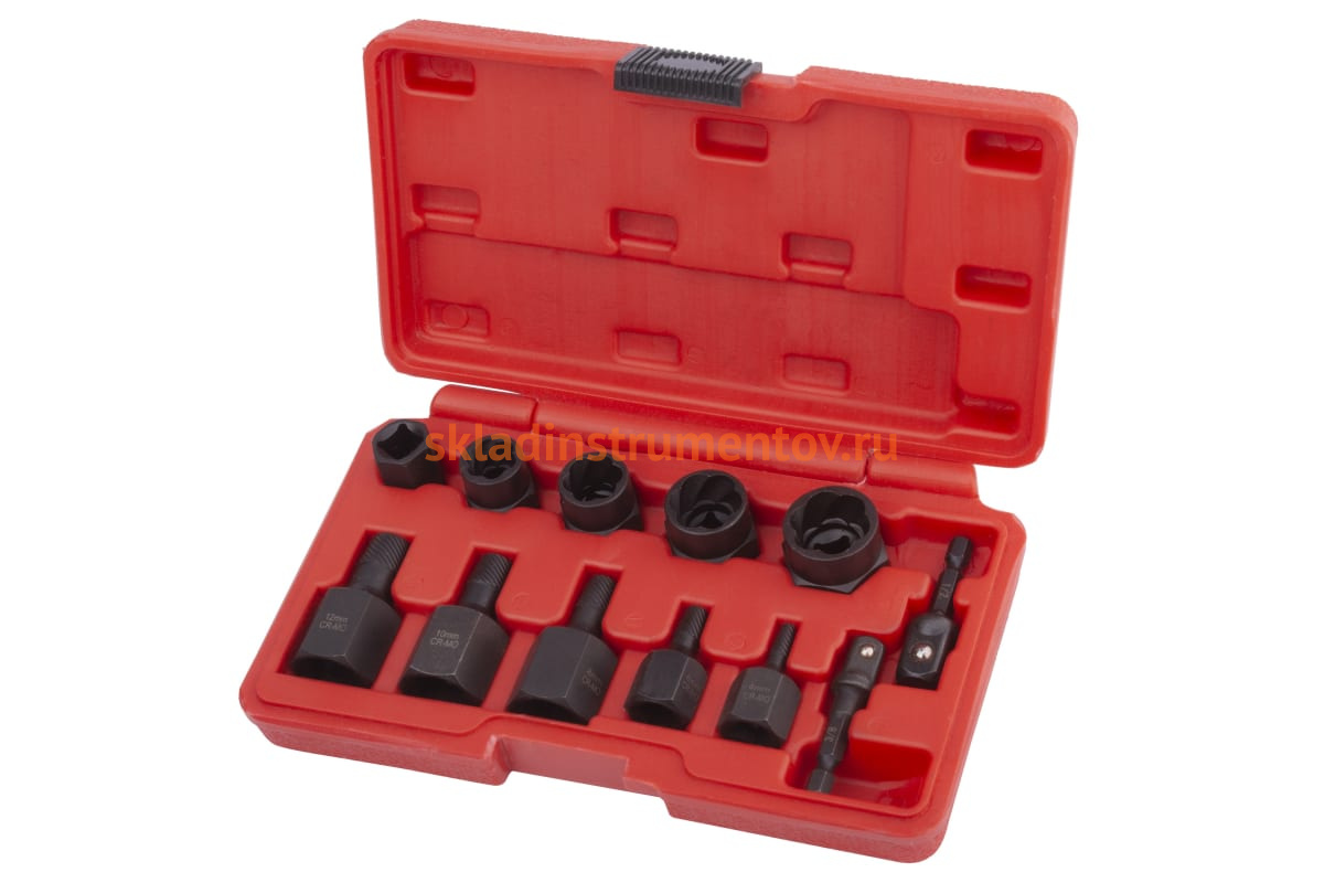 Набор экстраторов поврежденных болтов, гаек, шпилек, 12 предметов AV Steel AV-921093 предназначен для демонтажа поврежденного крепежа, адаптеры имеющиеся в наборе позволяют использовать мощные шуруповерты и дрели на низкий оборотах. Все экстракторы изготовлены из хромомолибденового сплава.