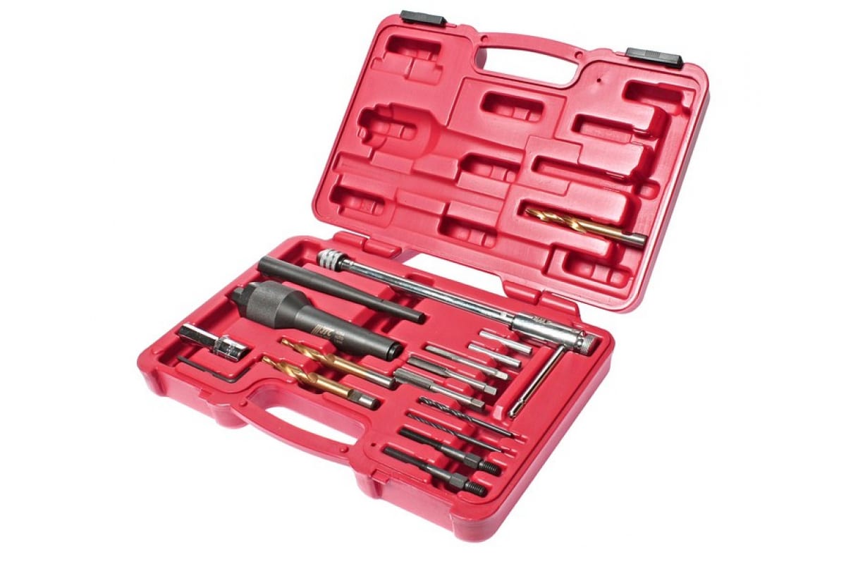 Набор инструментов для извлечения свечей накаливания, 16 предметов JTC 4054 поставляется в прочном компактном кейсе, оснащенном транспортировочной рукояткой, специальными замками-защелками и индивидуальной ячейкой под каждое из приспособлений. Помимо основной функции - демонтажа свечей, данный комплект подходит для ремонта резьбы в их колодцах, высверливания и изъятия болтов, шпилек, а также свечей зажигания.