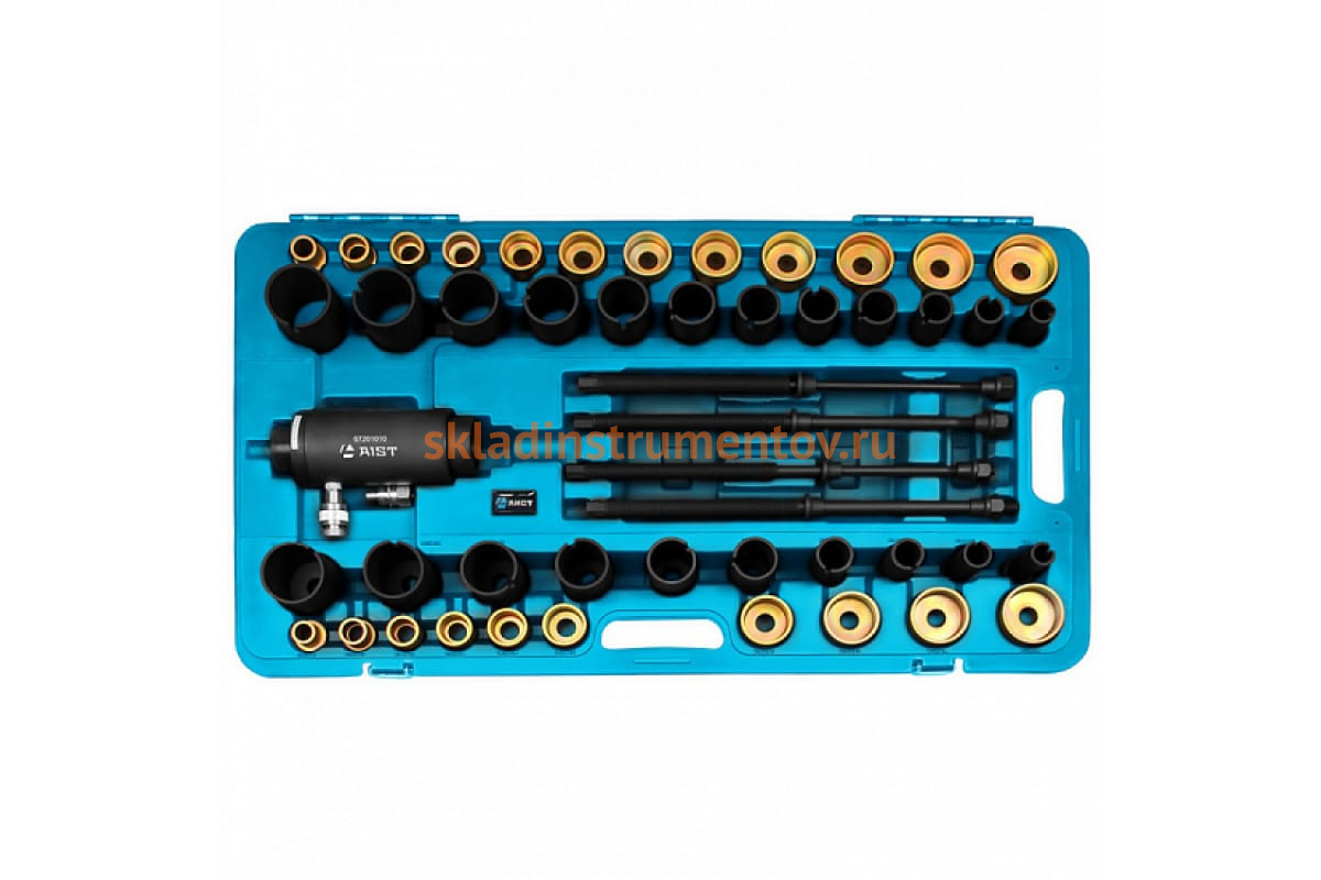 Гидравлический съемник сайлентблоков 18.2т с набором гильз 49 предметов AIST 00-00010884 можно использовать для снятия подшипников, вкладышей и сайлентблоков.
