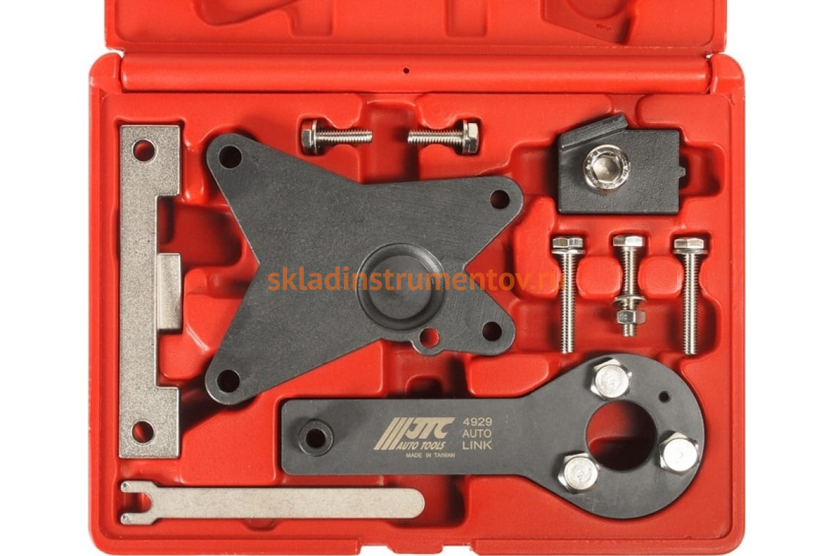 Набор фиксаторов валов и натяжного устройства приводного ремня FIAT JTC 4929 широко используется в автосервисах. Включает в себя различные фиксирующие приспособления. Применяется для правильной установки фаз газораспределения двигателя при замене приводного ремня. Набор поставляется в прочном кейсе c защелкой, что исключает выпадение приспособлений.
