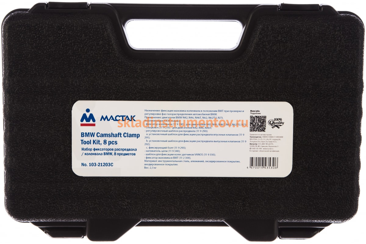 Набор фиксаторов распредвала / коленвала, BMW, кейс, 8шт МАСТАК 103-21203C представляет собой сочетание специнструментов для фиксации маховика коленчатого вала в положении ВМТ на двигателях N42, N46, N46T, N62, N62TU, N73 у автомобилей марки BMW.