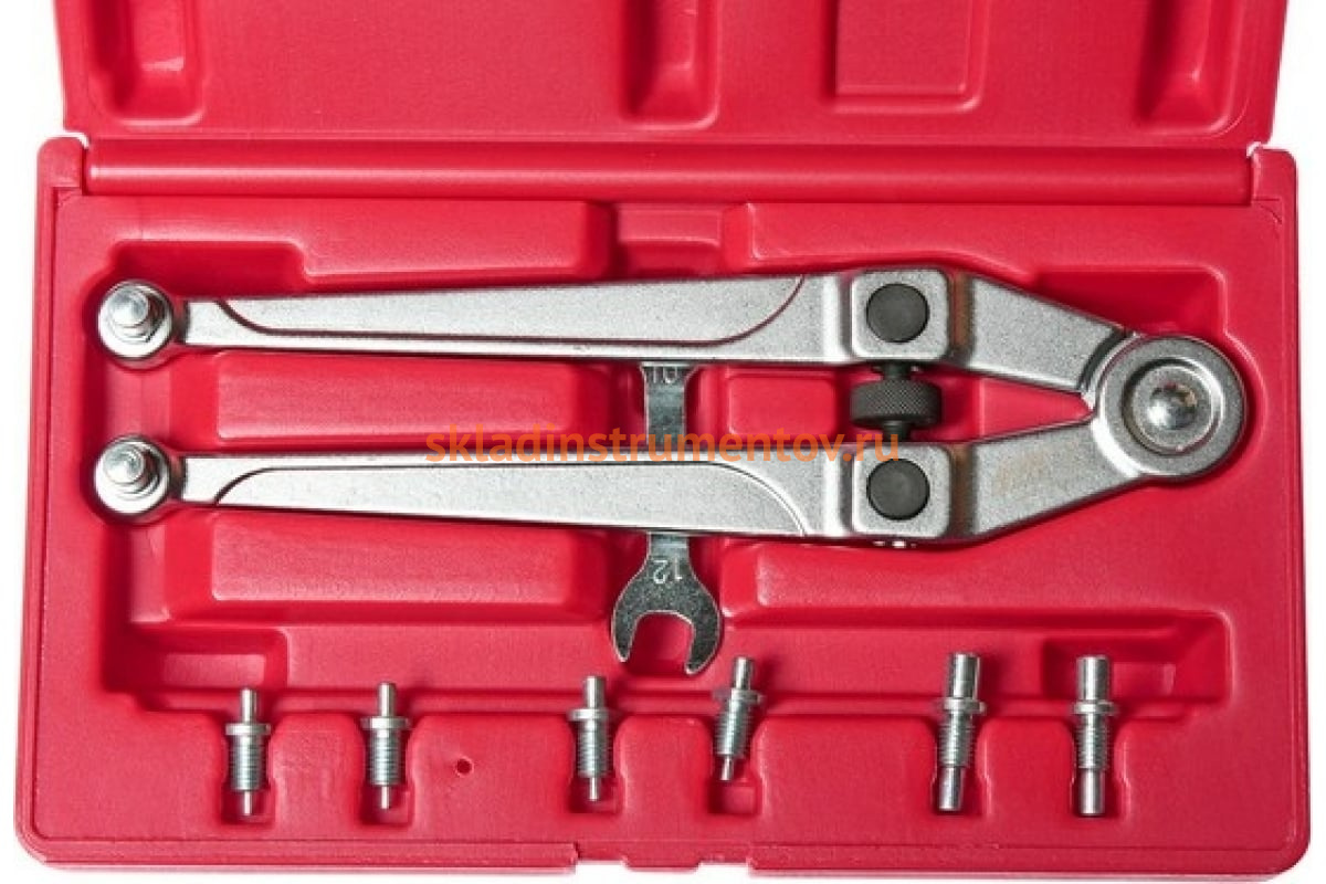Универсальный фиксатор шкива JTC 4755 представляет собой набор непосредственно из фиксирующего инструмента, съемных штифтов размерами 2.5, 3, 4, 5, 6, 7, 8, 9 мм, а также регулировочной гайки. Общая длина инструмента составляет 250 мм, а его рабочий диапазон - минимум 19 мм.