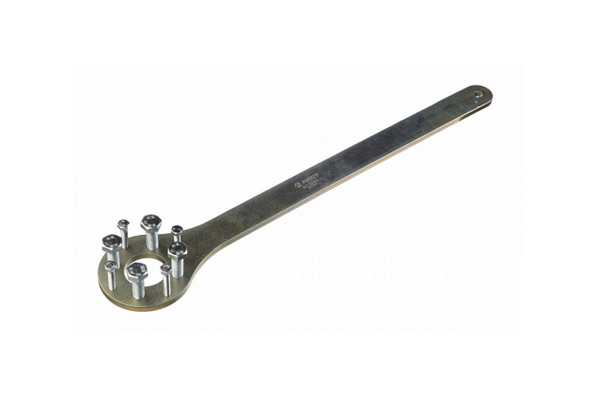 Инструмент оснащен длинной рукояткой, которая значительно облегчает процесс вращения и фиксации шкива.