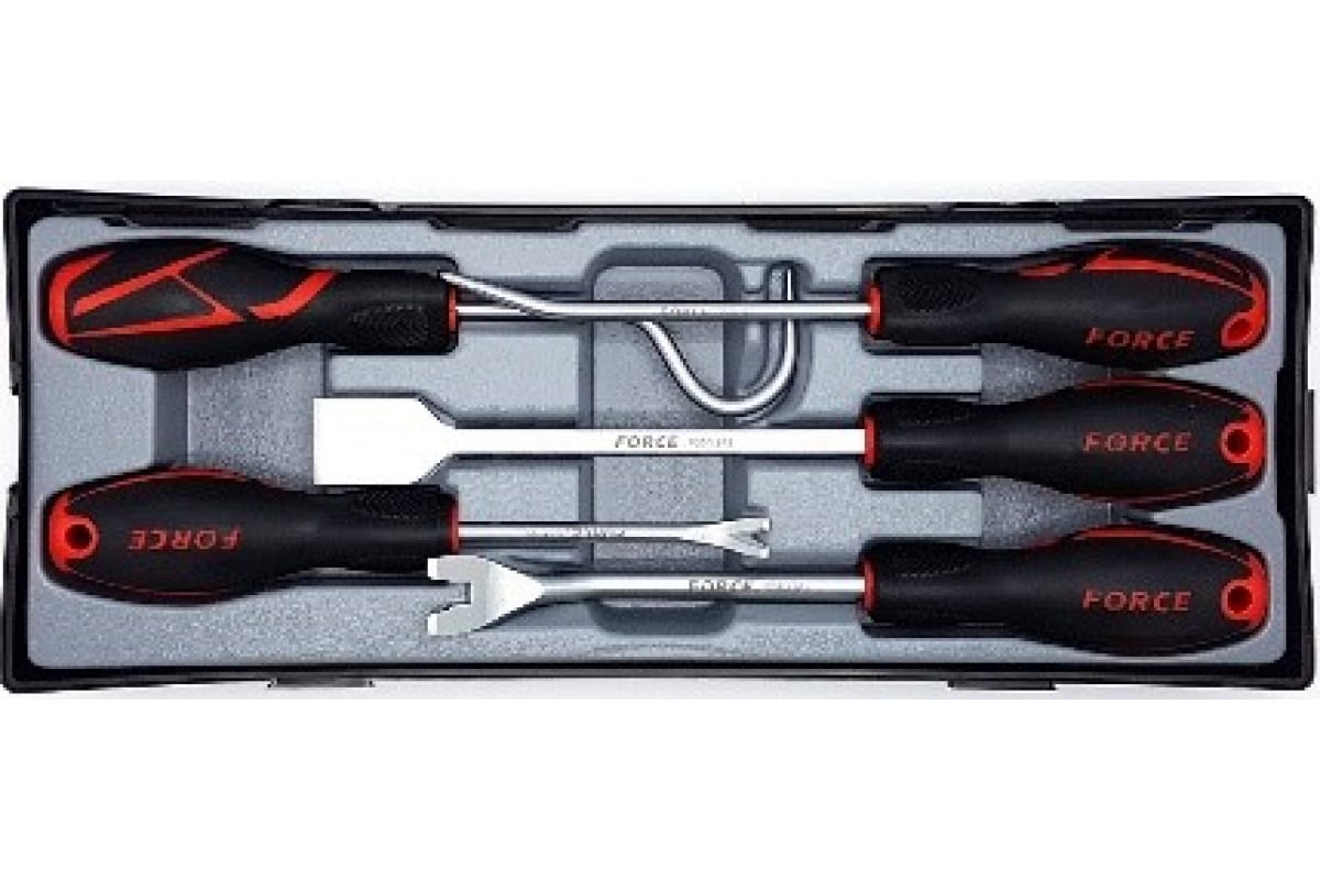 Набор для демонтажа обшивки автомобиля. 5 предметов FORCE T905M2 уложены на прочный и надежный ложемент. Удобный инструмент позволяет без риска сломать или повредить панели, снять всю внутреннюю обшивку машины.