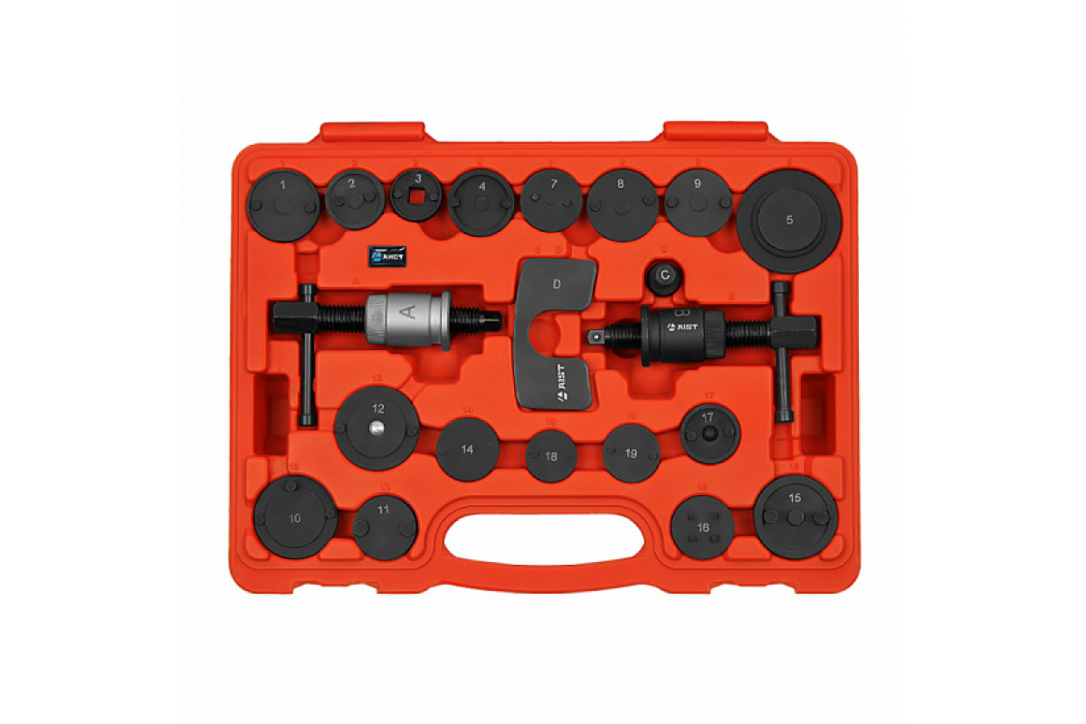 Инструмент для утапливания поршней тормозных цилиндров в наборе 21 предмет AIST 67944720 00-00009621 поставляется в прочном кейсе.