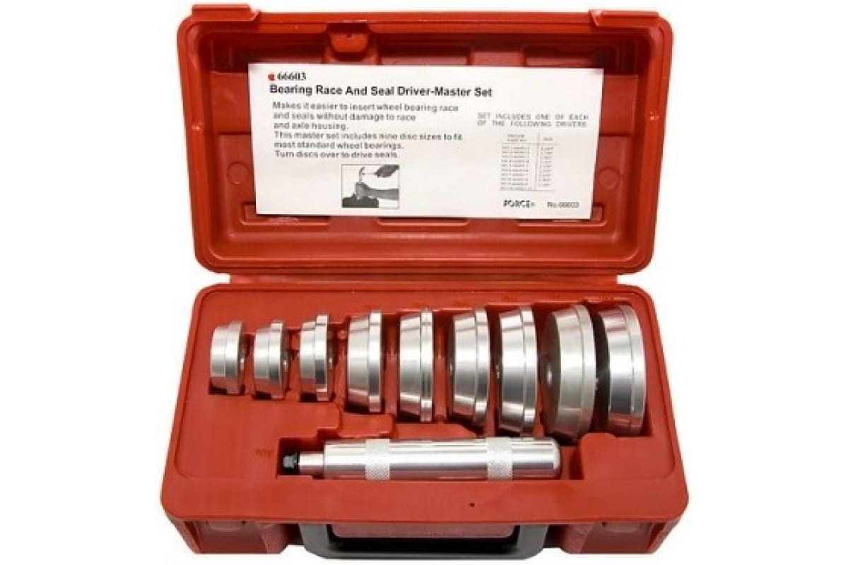 Набор оправок для запрессовки подшипников 10шт FORCE 66603 включает в себя разнообразные по размеру приспособления, которые позволяют выполнять широкий спектр демонтажных работ с подшипниками. Весь комплект удобно располагается в кейсе с ручкой для переноски и крышкой на замках.