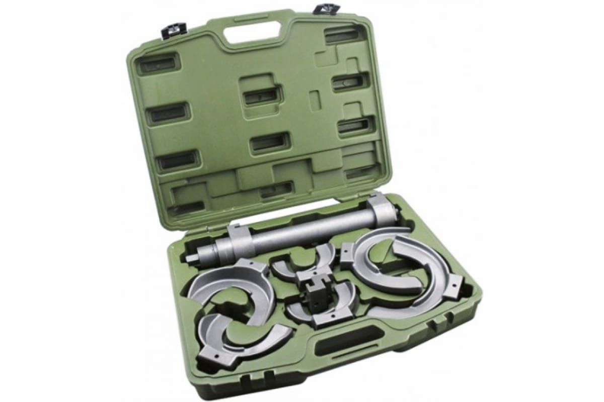 Стяжка пружин для подвески Макферсон Дело Техники 810330 представляет собой комплект оборудования, который применяется для работы с пружинами подвески. В набор входит три захвата различных размеров для пружин 80-115 мм, 110-150 мм и 140-195 мм. Имеется высокопрочный винт с трапециевидной резьбой для максимально эффективной работы по стягиванию пружин.