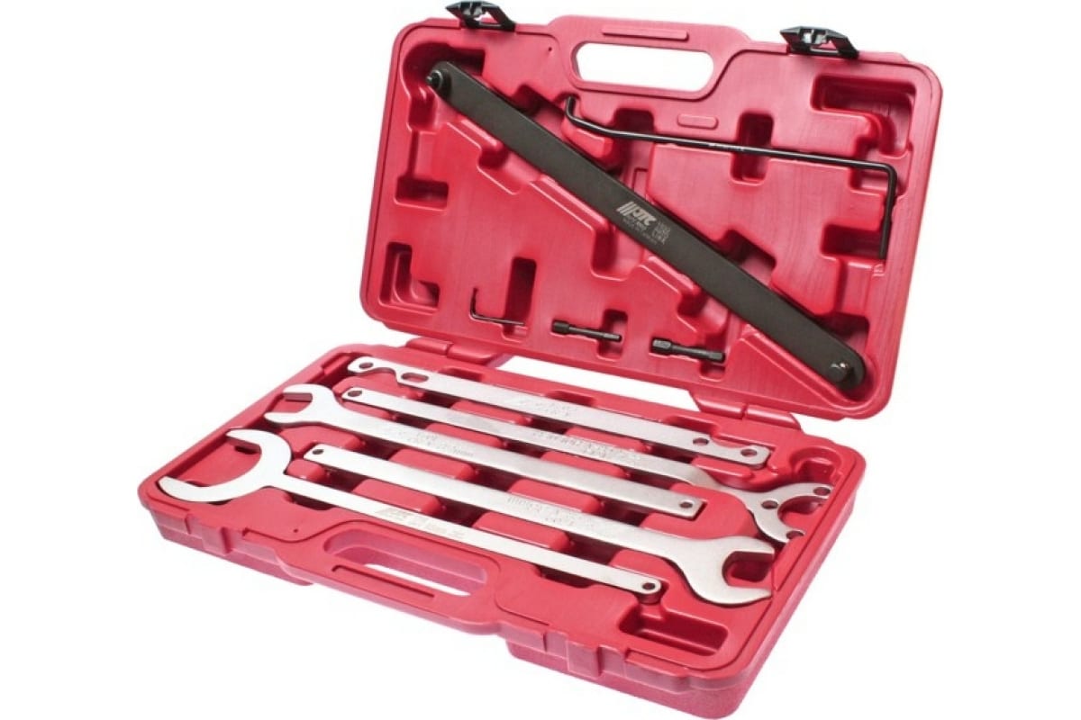 Комплект ключей для разборки термомуфт JTC 1313 - это универсальный набор, который активно применяется в различных автомастерских как с большим, так и с малым потоком обслуживаемого транспорта. С помощью входящих в комплект инструментов можно осуществить быстрый и аккуратный демонтаж термо- и вискомфут, зафиксировать шкив помпы, снять фиксирующие гайки и проч.