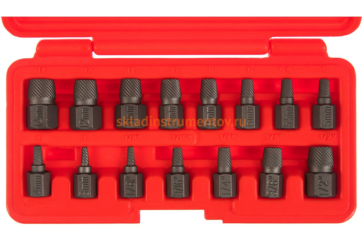 Набор экстракторов 1/8"-1/2", 3-14 мм (15 предметов, кейс) JTC 4639 позволяет аккуратно извлекать сломанные или заклинившие болты из установочных отверстий. Комплект стальных экстракторов разного размера применяется вместе с гаечным ключом или головкой.