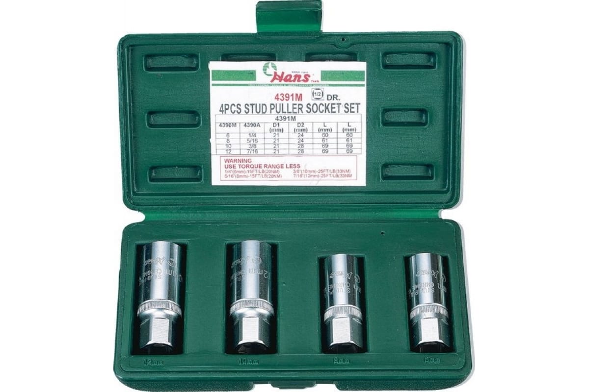 Набор шпильковертов Hans 4391M используется для работы с крепежными элементами, имеющими поврежденную конструкцию, которые тяжело поддаются извлечению обычными головками. В комплекте представлено 4 предмета различных размеров, все компоненты удобно упакованы в закрывающийся пластиковый футляр.
