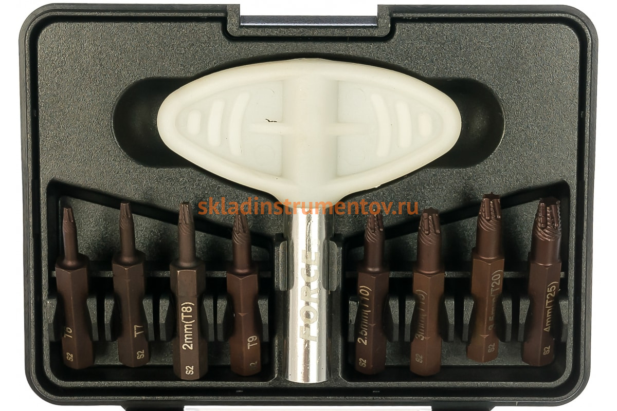 Комплект дополнен удобной рукояткой и уложен в специальный кейс. Шестигранный хвостовик оптимален для работы с большими усилиями.