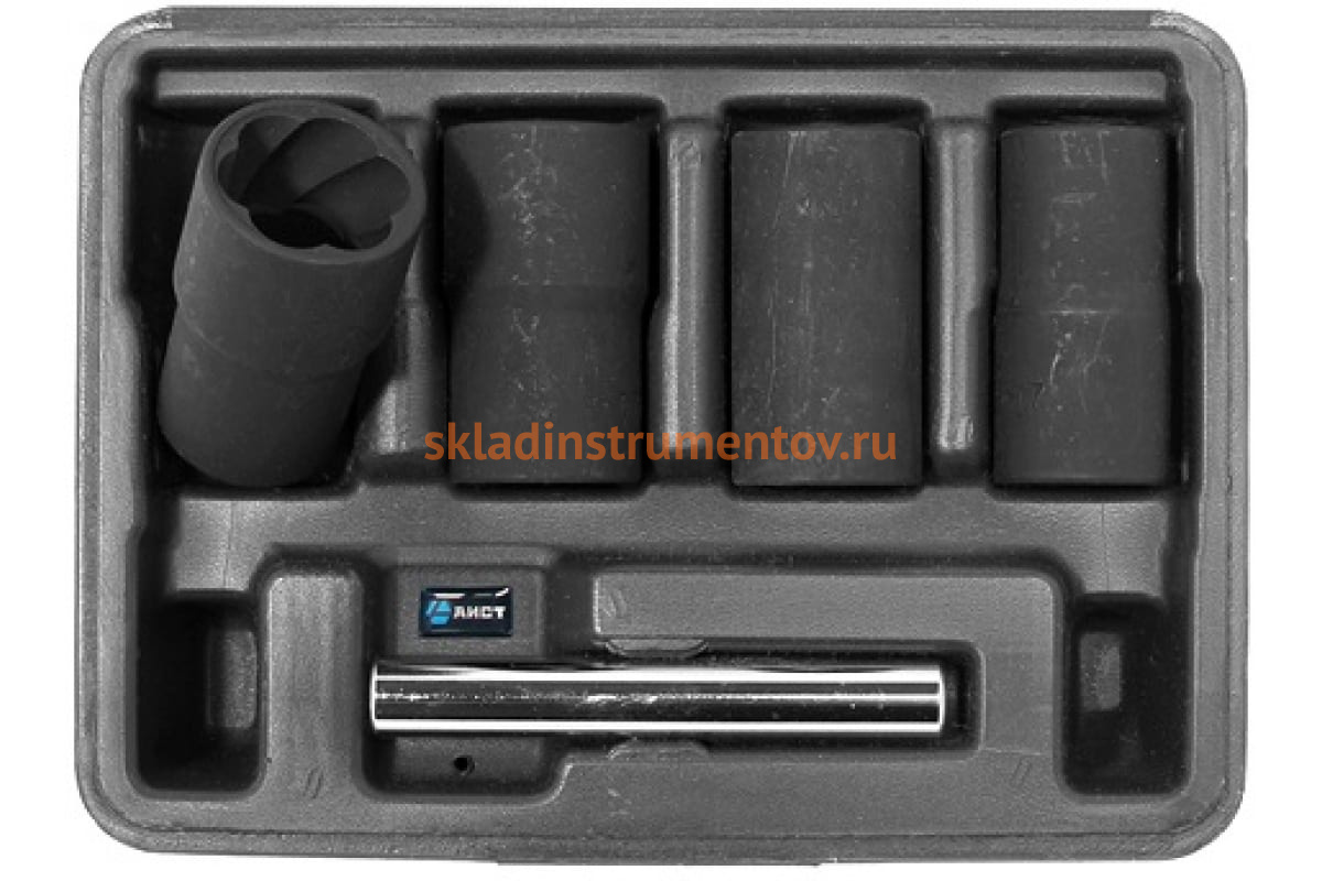 Набор наружных экстракторов 5шт AIST 00-00008931 комплект демонтажных инструментов для извлечения крепежа с зализанными гранями. Подходит для работы с секретками на автомобильных колесах. Приспособления изготовлены из хром-молибденовой стали с твердостью 52-55 HRC. Привод - 1/2 дюйма. Набор соответствует стандарту AISI4340.