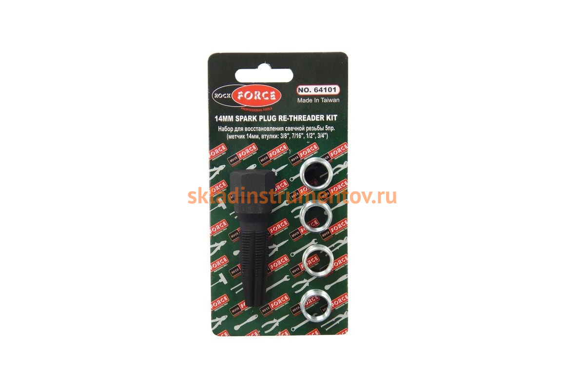 Слесарный набор для восстановления резьбы свечи зажигания 5 предметов ROCKFORCE RF-64101 подходит для работы с дюймовыми резьбами.