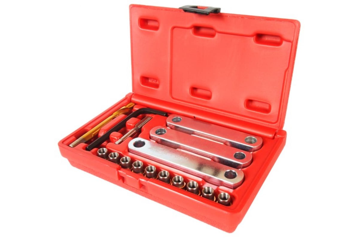 Набор для восстановления резьбы OPEL, FORD, VW, AUDI JTC 4880 весит 980 грамм. Данный набор применяется в процессе замены тормозных колодок в случае случайного повреждения резьбы направляющего штифта. Кейс существенно облегчает транспортировку инструментов.