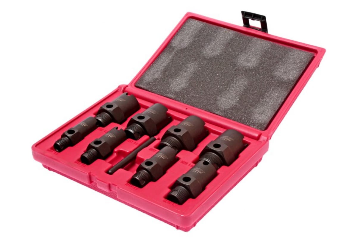 Набор инструментов для восстановления резьбы штуцеров систем кондиционирования (9 предметов) JTC 1361 включает в себя метчики следующих размеров - М28-1.5Р, М27-2Р, М24-1.5Р, М22-1.5Р, М20-1.5Р, М18-1.5Р, М16-1.5Р и М14-1.5Р. Набор позволяет реставрировать как наружную, так и внутреннюю резьбу.