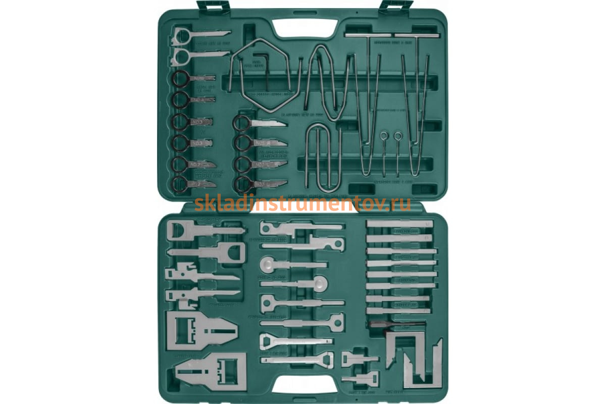 Набор съемников Jonnesway AR060043 49451 представляет собой комплект специализированных инструментов для установки и снятия автомобильной радиоаппаратуры. Приспособления разделены по маркам производителей аппаратуры и автомобилей. Для удобства хранения и транспортировки без риска утери каждый компонент располагается в отдельном ложементе пластикового, закрывающегося кейса.