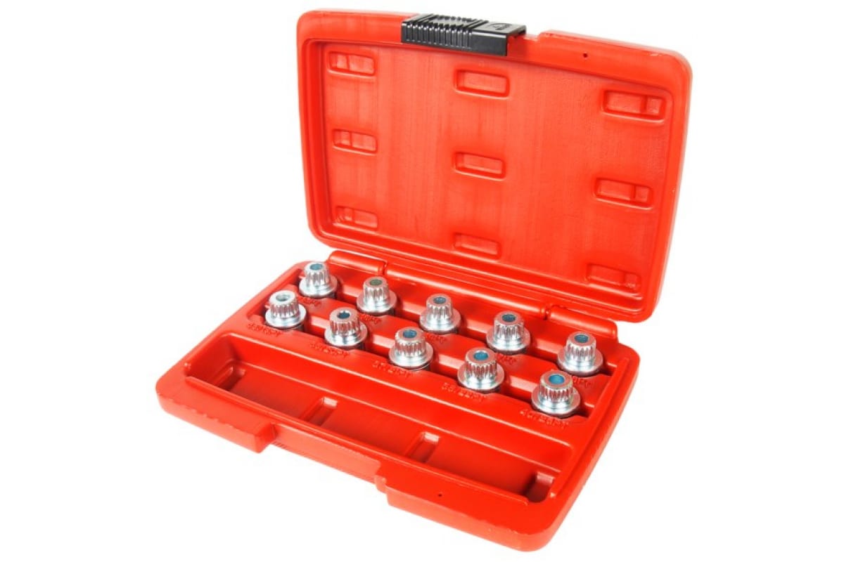 Набор головок для секреток колесных дисков BMW JTC 4318 используется в шиномонтажной мастерской, автосервисе, частных гаражах. Богатый ассортимент оснастки позволяет с легкостью снимать и устанавливать секретки колесных дисков автомобилей БМВ различных моделей.