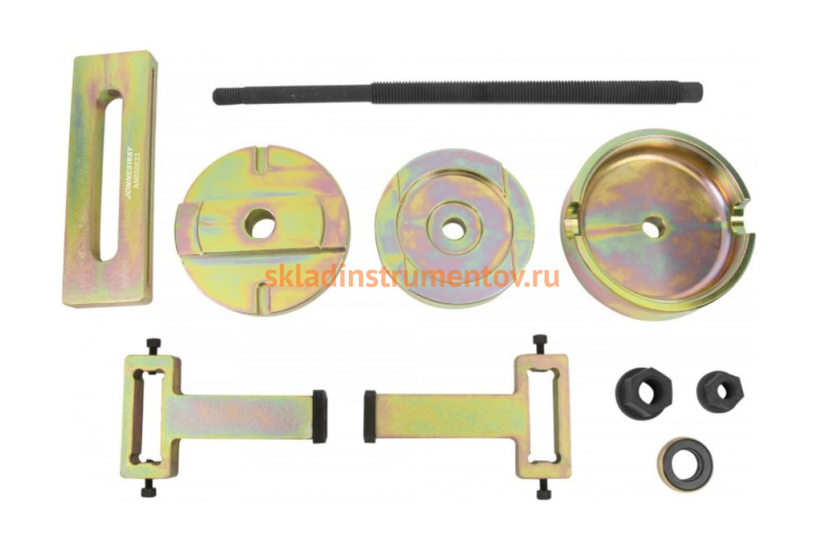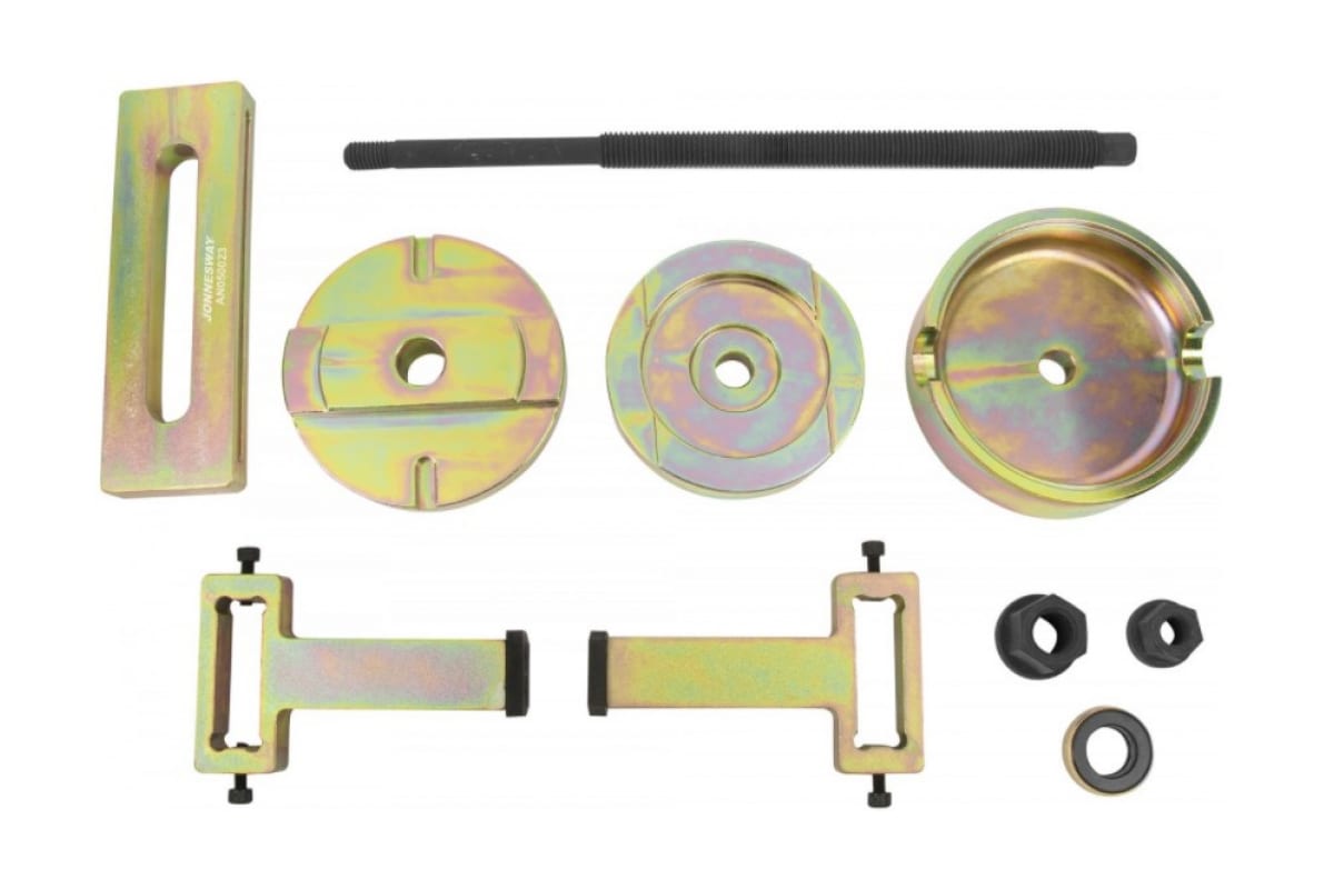 Набор приспособлений для снятия и установки сайлентблоков заднего подрамника Jonnesway AN050023 BMW X5 /E53/ 49643 значительно упрощает работу по снятию резинометаллических деталей подрамника, что ускоряет процесс демонтажа сайлентблоков. Инструмент подходит для кузова E53 (до 2006 года). Набор также используется для BMW 33 4 140.