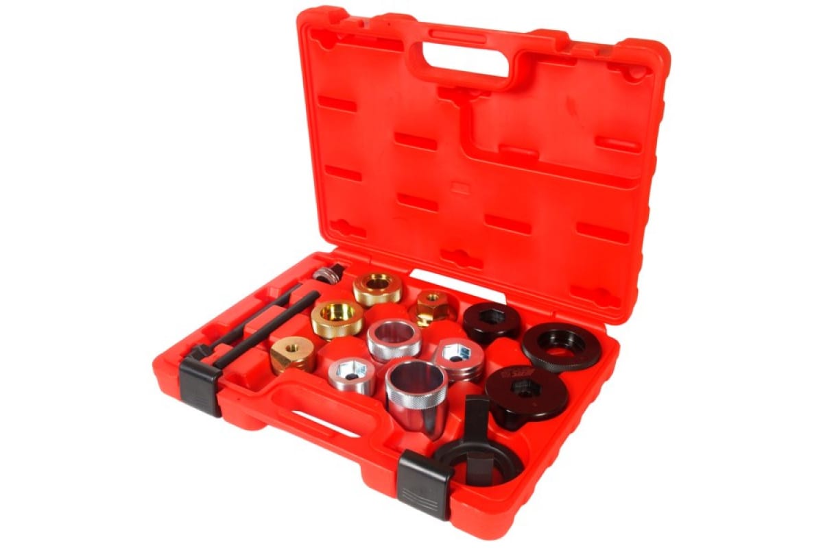 Набор инструментов для снятия и установки сайлентблоков задней подвески BMW E36, E46, Е85 JTC 1215 отличается удобством в работе и не требует предварительного демонтажа подрамника: обслуживание узлов осуществляется непосредственно на автомобиле.
