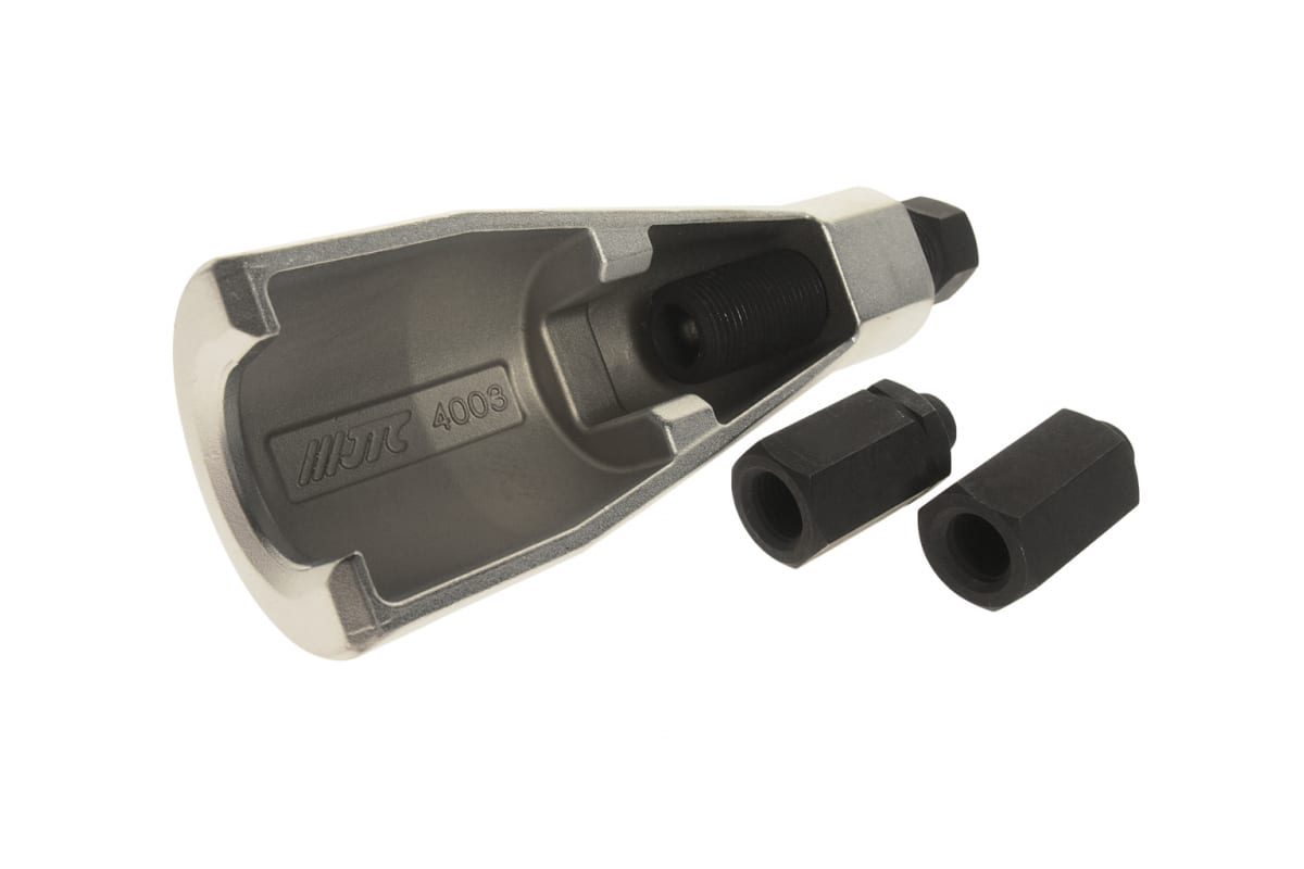 Съемник шаровых опор VOLVO JTC-4003 позволяет бережно, не повреждая резьбы, демонтировать шаровые опоры. Приспособление изготовлено из высококачественной стойкой к нагрузкам стали. В комплекте со съемник поставляются резьбовые проставки размером M14 x 1.5, M14 x 2.0. Данное приспособление используется совместно с автомобилем VOLVO.