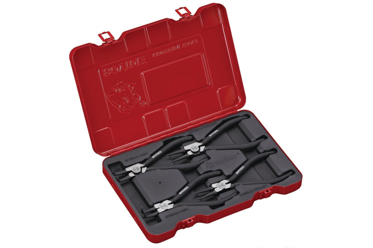 Набор съемников колец BOVIDIX 288400402 представляет собой качественный и прочный ручной инструмент для ремонта автомобильных узлов. Различная конфигурация приспособлений позволяет уверенно работать как с внешними, так и с внутренними стопорными кольцами. Все съемники укладываются в металлический кейс, который гарантирует их бережную транспортировку. Рукоятки съемников покрыты резиной. Габариты ящика - 190х45х288 мм.
