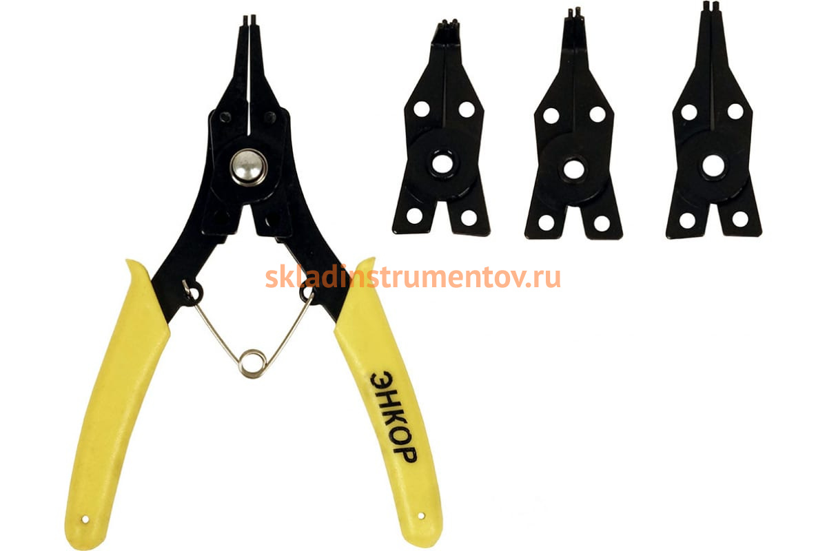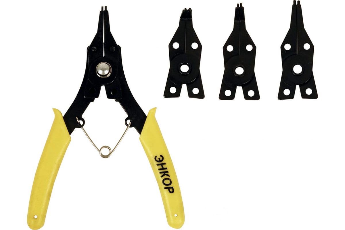 Съемник стопорных колец, универсальный 150мм Энкор 19055 - удобный инструмент, который рассчитан на использование с различными насадками для снятия стопорных колец.