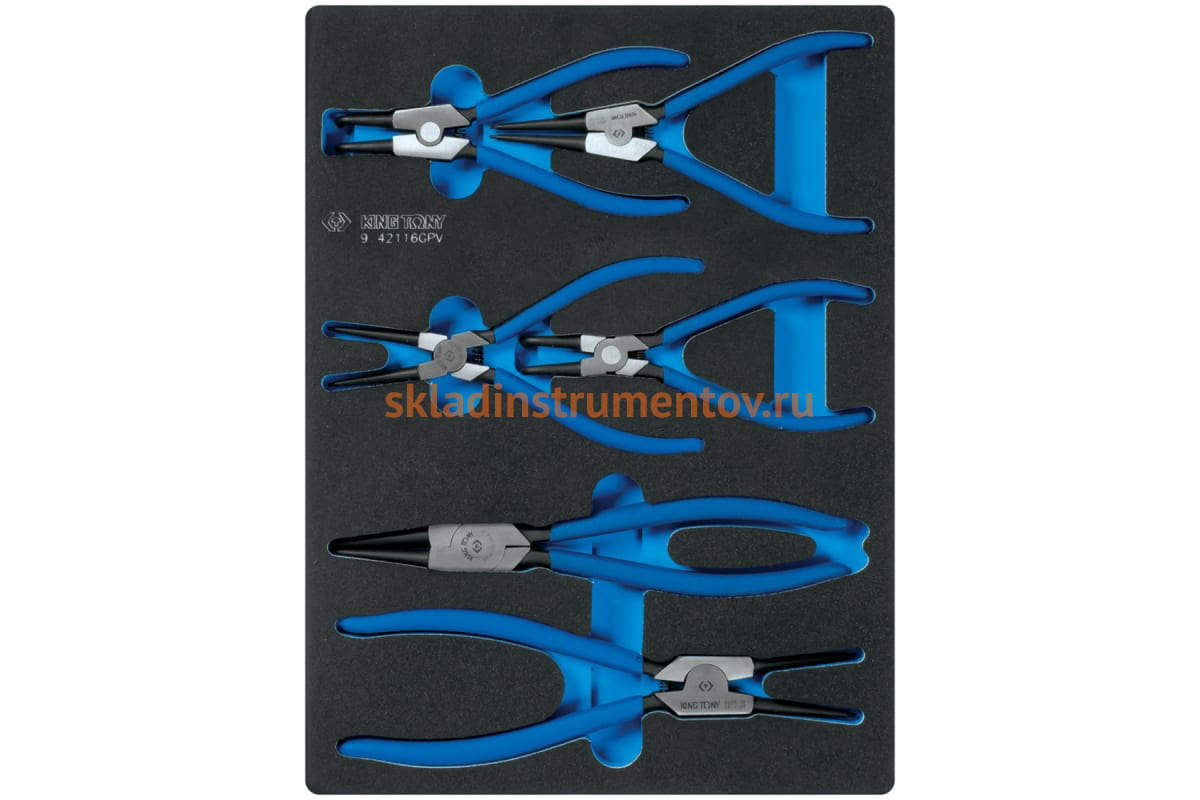 Набор съемников стопорных колец KING TONY ложемент, 6 предметов 9-42116GPV используют для быстрого демонтажа стопорных колец во время диагностики и обслуживания транспортных средств. Размер ложемента подходит для размещения на полке инструментальной тележки.