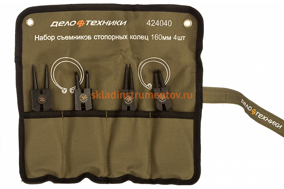 Набор съемников стопорных колец 160 мм х 4 шт тетрон ДТ/16 Дело Техники 424040 пригодится на производстве или в мастерской при снятии или установке стопорных колец - внутренних или внешних.. Рабочая часть изготовлена из хромванадиевой стали, которая обладает прочностью и повышенной стойкостью к изнозу. Удобные рукоятки-чехлы исключают скольжение и обеспечивают лучший контроль над инструментом. Тетроновая сумка предназначена для хранения и компактной переноски инструментов.
