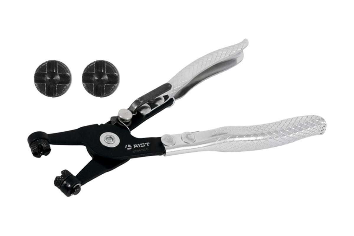 Щипцы с фиксатором для шланговых пружинных хомутов AIST 67941200 00-00003631 используется для обслуживания топливных, масляных, тормозных и водяных трубопроводов. Обеспечивает легкий и быстрый рабочий процесс по монтажу/демонтажу многоразовых самозажимных пружинных скоб (хомутов). Приспособление оснащено фиксатором и возвратной пружиной. Размер инструмента составляет 195 мм.