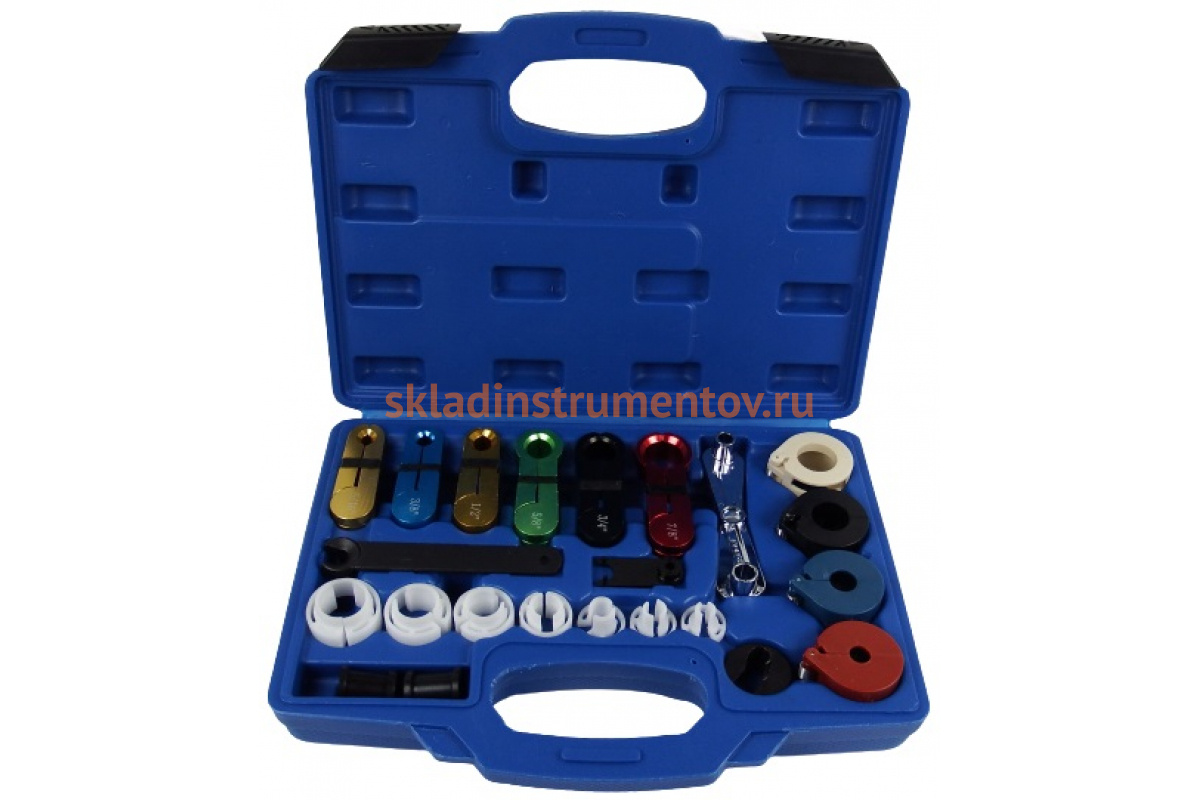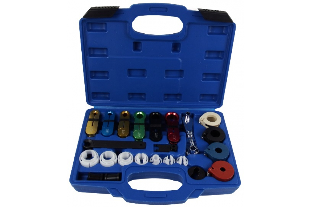 Съемники топливных линий AE&T 22 шт TA-A1039 - самый полный набор размыкателей для топливной системы и втулок автокондиционера. В основе инструмента - высокопрочный анодированный алюминий, который гарантирует долговечность и износостойкость. Разъединение происходит быстро, эффективно и без повреждений трубопроводов. Для удобного хранения и транспортировки инструмента производитель предусмотрел кейс из ударопрочного пластика.