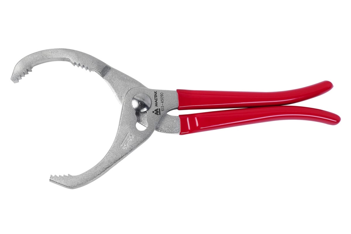 Шарнирно-губцевый съёмник масляных фильтров 60-90 мм МАСТАК 103-45090 активно применяется в процессе ремонта тракторов и грузовых автомобилей. 3 уровня регулировки позволяют легко и просто демонтировать фильтры диаметром от 60 мм до 90 мм. Изогнутые рукояти удобно лежат в руке оператора. Зубцы рабочей поверхности обеспечивают максимально возможное сцепление с извлекаемым элементом.