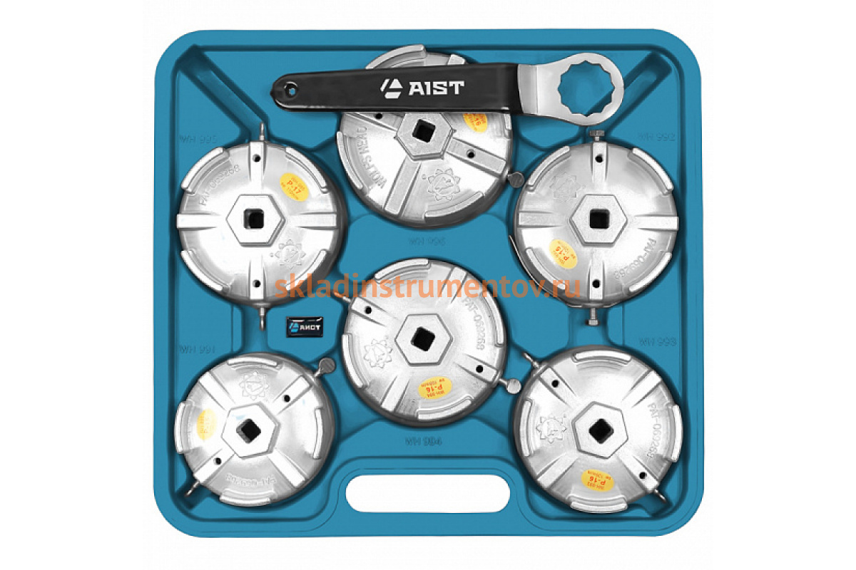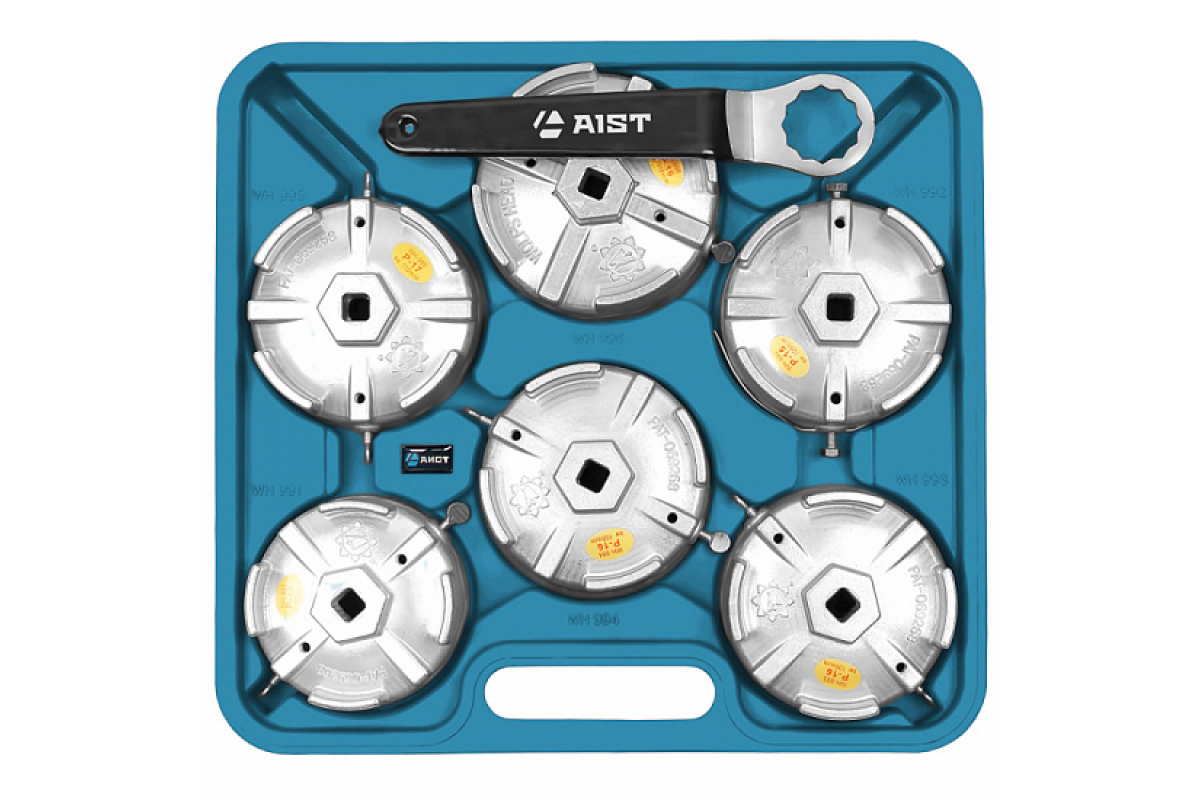 Набор съемников масляных фильтров "чашек" 100-110мм 7 предметов AIST 67250306 00-00004199 дополнительно оснащен ключом, который позволяет вращать съемники.