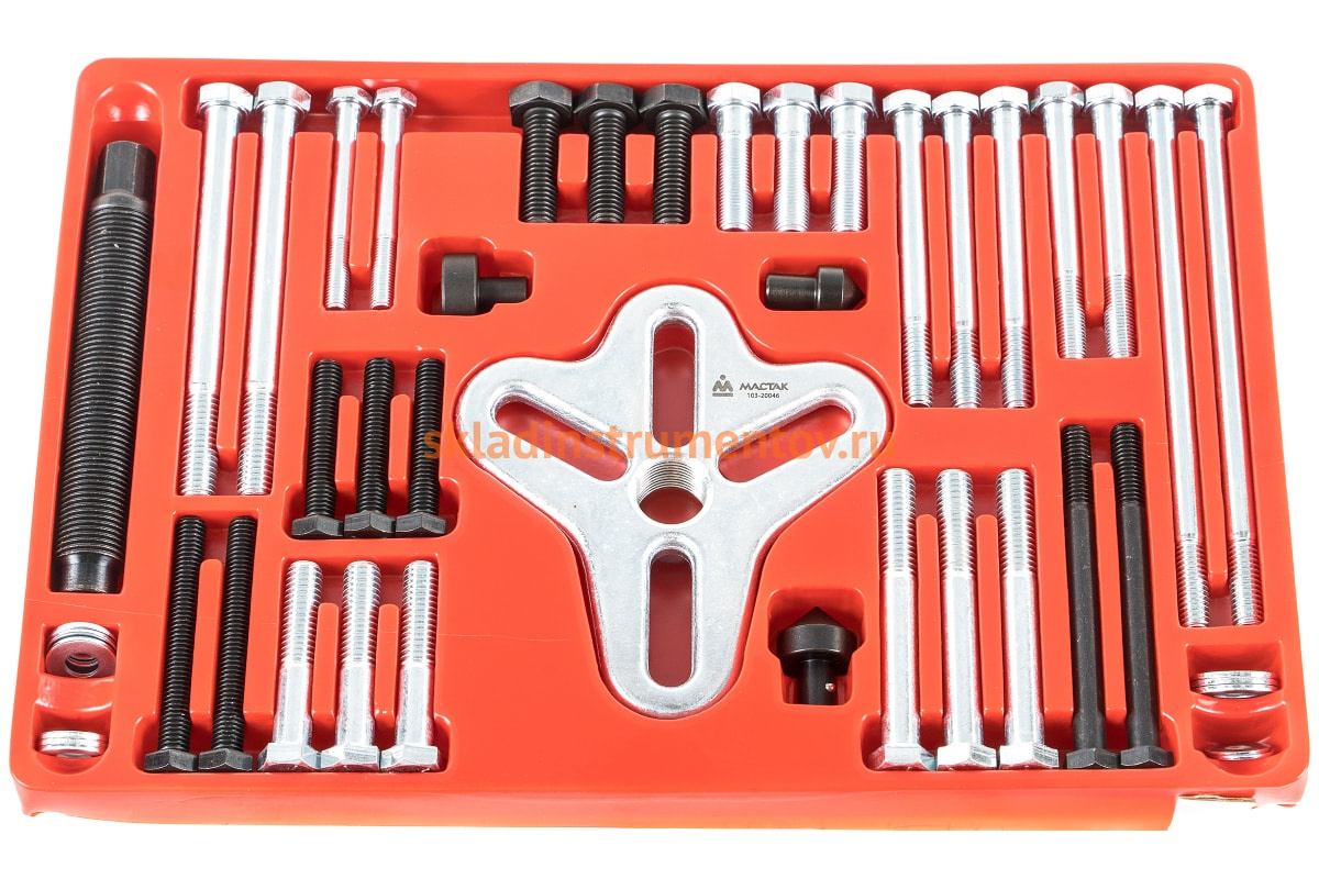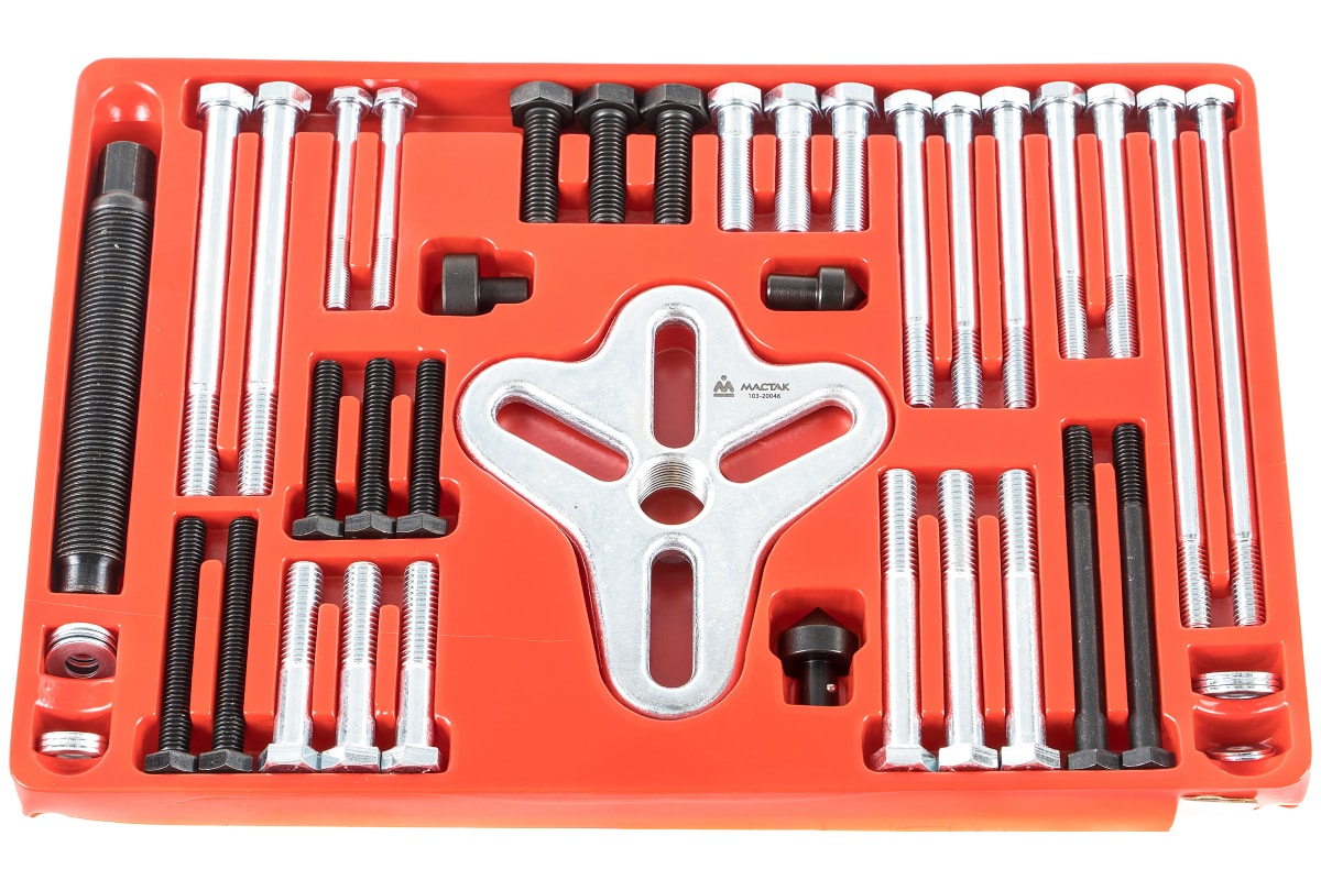 Съемник шкивов 25-100мм, 46шт МАСТАК 103-20046 представляет собой комплект специнструмента для ремонта двигателей автомобилей. При помощи широкого ассортимента данных приспособлений различных размеров от 25 до 100 мм можно быстро и легко извлекать шкивы. Для удобства хранения каждый элемент располагается в отдельной ячейке ложемента.