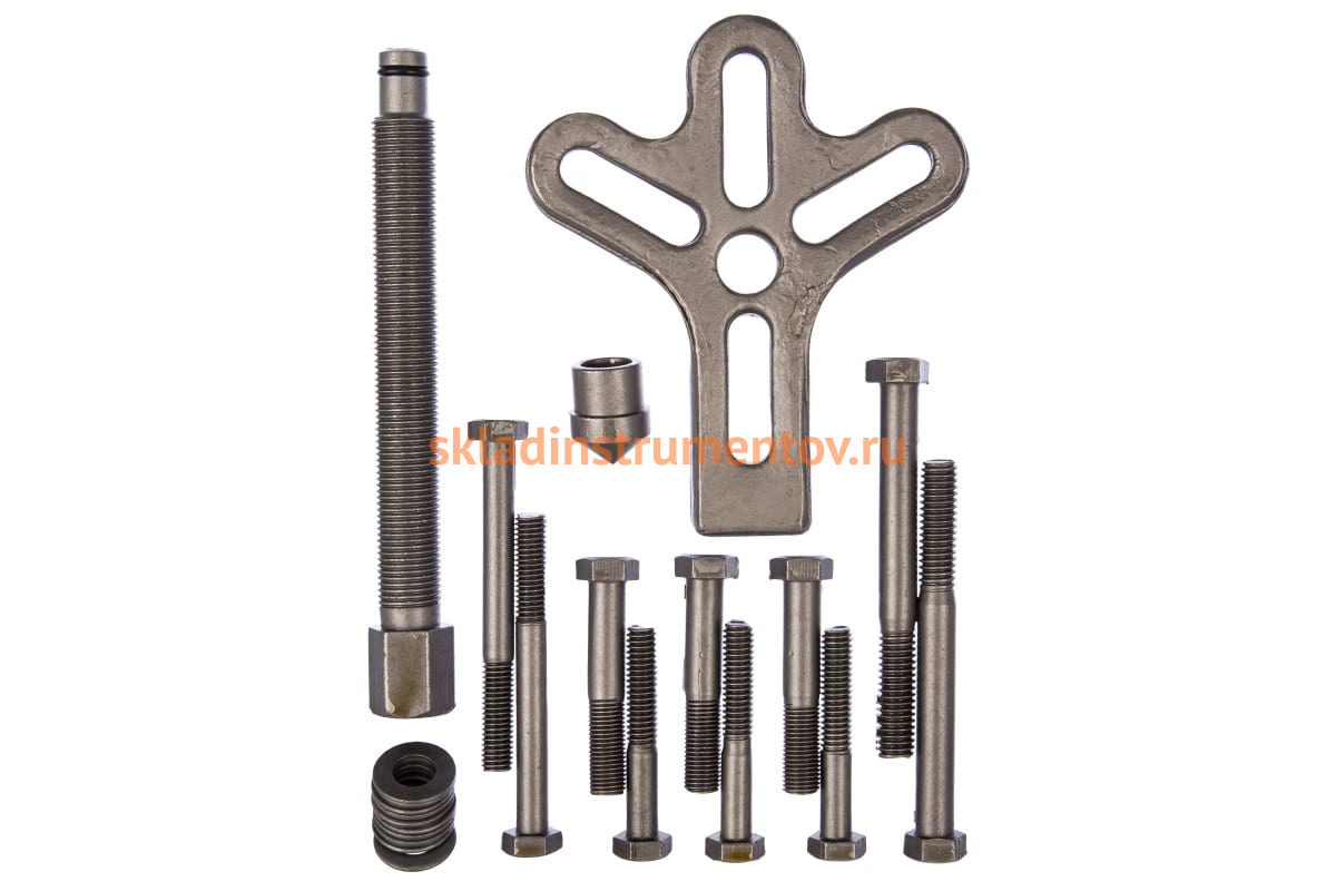 Съемник шкивов, 13 предметов Дело Техники 805013 относится к универсальному оборудованию. Центральная пластина разработа таким образом, чтобы успешно работать с разноформатным шкивам и зубчатым колесам при наличии резьбовых отверстий или обычных отверстий для болтов-захватов съемника. Силовой винт оснащен шестигранником для удобства вращения.