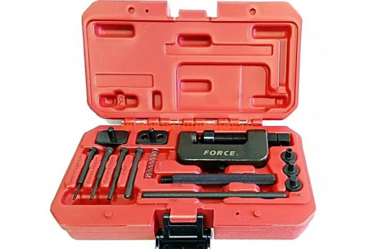 Набор для сборки и разборки мото цепей FORCE 913Y1 включает в себя 13 предметов, которые помогут упростить замену цепей мотоциклов и другой техники с цепным приводом. Предусматривает три размера штифтов, совместимых с большинством цепей (2,2 мм, 2,9 мм и 3,8 мм). Также предусматривает инструменты, необходимые для заклепывания основных звеньев с полыми осями. Все предметы помещены в удобный ударопрочный кейс.