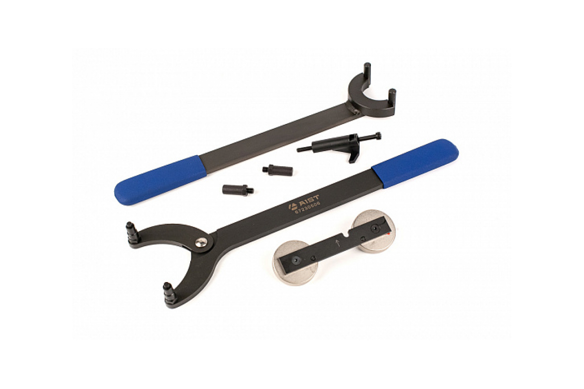 Набор для замены межвальной цепи распредвалов ГРМ и ГНЦ VAG 1.8 и 1.8 Turbo AIST 00-00017050 включает в себя специализированный инструмент, в том числе держатели и фиксаторы.