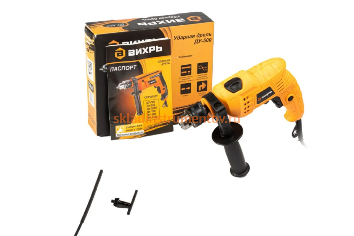 Ударная дрель Вихрь ДУ-500 72/8/7 используется для сверления отверстий и работы с крепежными элементами.